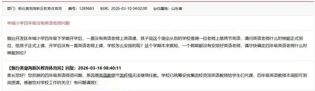近日,网友反映,山东烟台一小学新学期开学后,四年级一直没有英语老师上课,希望尽快安排英语老师。3月16日,当地教体局回复表示,四年级英语师资问题系因原英语老师突发疾病无法继续任教,已安排其他英语老师代课。